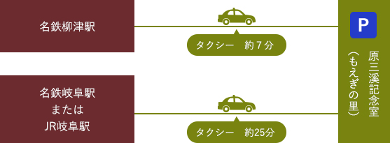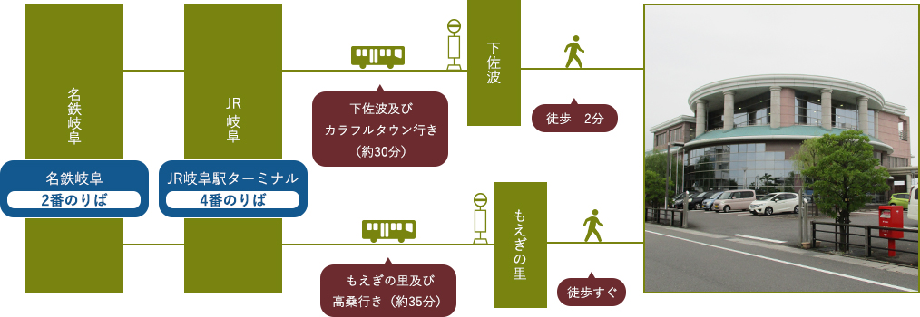 名鉄岐阜 ― JR岐阜 ― もえぎの里(約35分) ― 徒歩すぐ