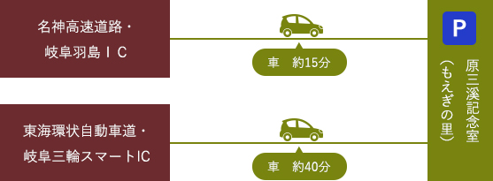 • 名鉄岐阜駅またはJR岐阜駅からもえぎの里まで約25分